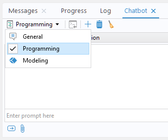 A close-up of the Chatbot window and its chat subject options, including, General, Programming, and Modeling. Now, type the prompt Create a geometry of a cylinder.