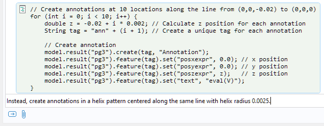 A close-up the prompt in the Chatbot window, set to Instead, create annotations in a helix pattern centered along the same line with helix radius 0.0025. Click the Submit button or press Enter.