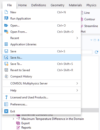 A close-up of the Save as type dropdown menu, with Model File for Java highlighted. This will create a text file with a .java extension, which can be compiled into a Java .class file for use as a standalone Java component. This approach runs COMSOL Multiphysics® without the COMSOL Desktop® user interface. The .java file contains the entire model setup through API code. In this case, however, we will use the file solely to identify potential issues in the model setup. (Note that using this functionality is unrelated to compiling apps with COMSOL Compiler™.)